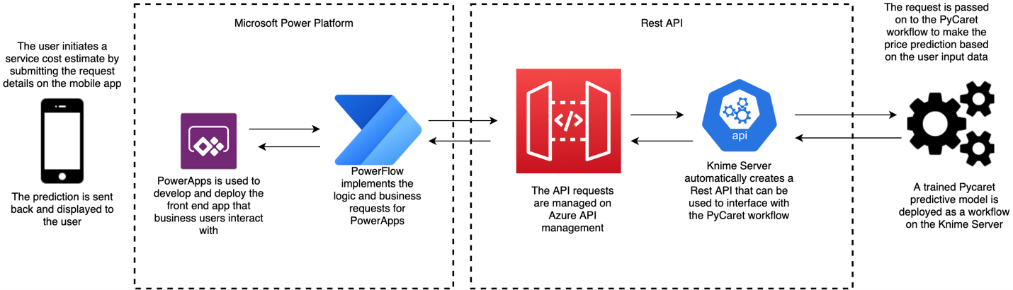 When a field user requires a price estimate for a service request, they open the PowerApps application on their device (phone, computer, etc.), and the enter the service request details – such as the type of service required, urgency, etc. The user then submits the request, and immediately receives back a predicted cost.