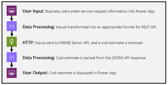 Power Automate runs the back-end process of the Power App. The user inputs are composed into a JSON format for the HTTP request. After the request is sent to the KNIME Server API, the process receives a JSON response from the deployed machine learning model. The cost estimate is then parsed from the JSON response, and displayed in the App in a simple way.